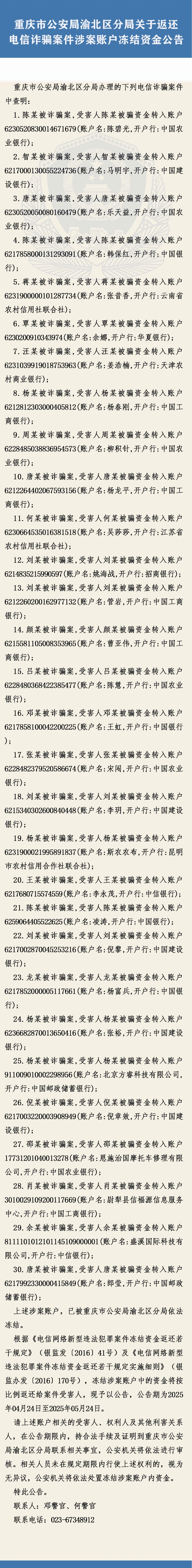 重慶市公安局渝北區分局關于返還電信詐騙案件涉案賬戶凍結資金公告