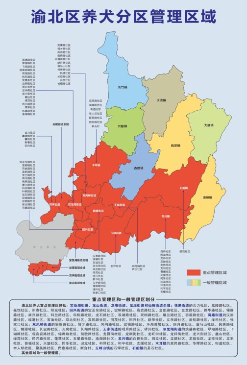 渝北區養犬重點管理區包括:寶圣湖街道、龍山街道、龍塔街道、龍溪街道和仙桃街道全域;悅來街道的合力社區、嘉陵路社區、嘉悅社區、新春社區、陽光社區;回興街道的寶圣東路社區、寶桐路社區、高巖路社區、金凱路社區、金蘭路社區、錦華路社區、錦屏路社區、康興路社區、科蘭路社區、科桐路社區、龍石路社區、雙湖路社區、雙桐路社區、馨蘭路社區、羽裳路社區;兩路街道的漢渝路社區、臨港社區、石油社區、雙北街社區、雙鳳路社區、同茂社區、同興社區、新華社區、義學路社區、渝航路社區、澤科社區、張家口社區;雙鳳橋街道的安康路社區、博才路社區、鳳鳴路社區、宏錦路社區、環湖雅居社區、朗月路社區、溜馬山社區、民秀路社區、桃源社區、長空路社區、瓦房社區、長翔路社區;王家街道的觀月路社區、硚田社區;雙龍湖街道的濱港路社區、翠湖路社區、飛湖路社區、觀音巖路社區、錦湖路社區、凱歌路社區、龍昌街社區、龍順街社區、龍旺街社區、龍祥街社區、龍興街社區、鹿山社區、綠茂社區、民興路社區、蓬萊社區、五星路社區、渝湖路社區;龍興鎮的白橋社區、回龍社區、龍德社區、龍駿社區、龍祥社區、龍羽社區、普福社區、天堡社區、同樂社區、迎龍社區、和澤社區、和平社區、支援社區;木耳鎮的富民路社區、華暉路社區、街道社區、舉人壩社區、聚英路社區、民意路社區、新合村;玉峰山鎮的石坪社區;石船鎮的圣石社區。其他區域為一般管理區。